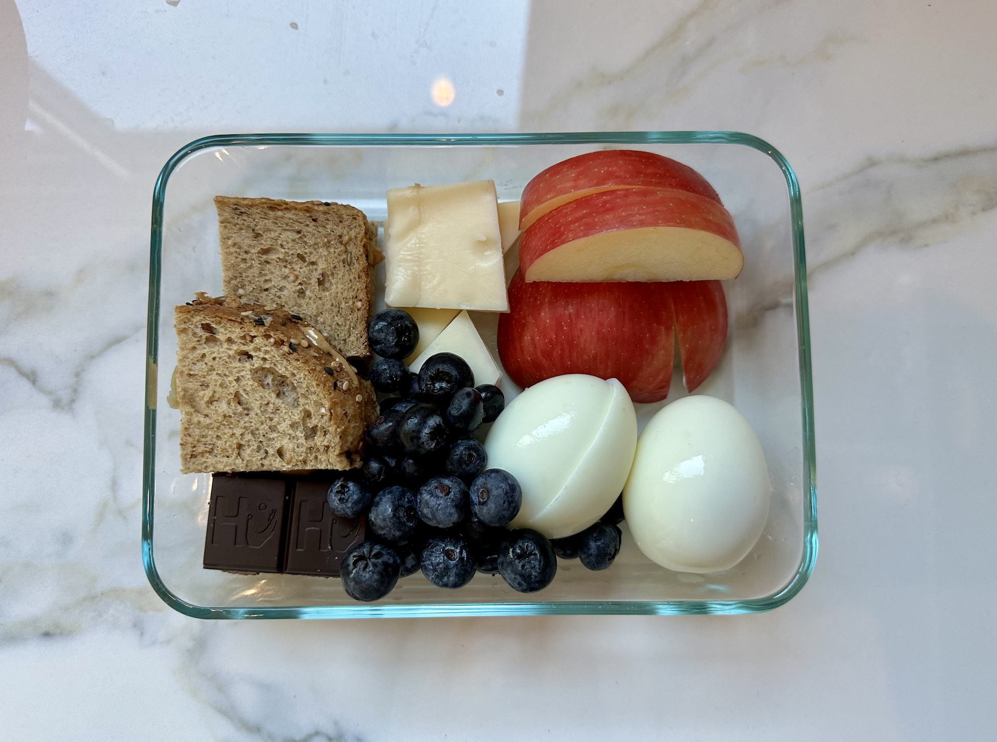 Occasionally, we find ourselves grabbing one of those sad-looking Starbucks protein boxes on the go. I figured, why not make an absolutely lovely, organic, fresh, and delicious version at home. These have Hu chocolate, gouda, swiss cheese, white cheddar, jammy eggs, organic Honeycrisp apples, organic blueberries, and crunchy honey peanut butter sandwiches.